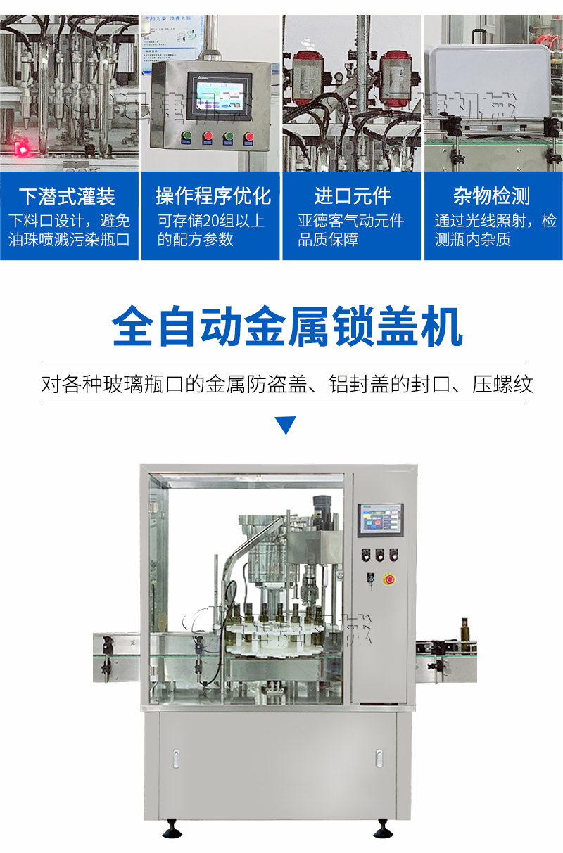 本設(shè)備適用于醫(yī)藥、農(nóng)藥、食品、化妝品、化工等行業(yè),主要針對(duì)各種玻璃瓶口的金屬防盜蓋、鋁封蓋的封口、壓螺紋等。該設(shè)備可單機(jī)使用,也可以與灌裝機(jī)等設(shè)備組成生產(chǎn)流水線自動(dòng)作業(yè);