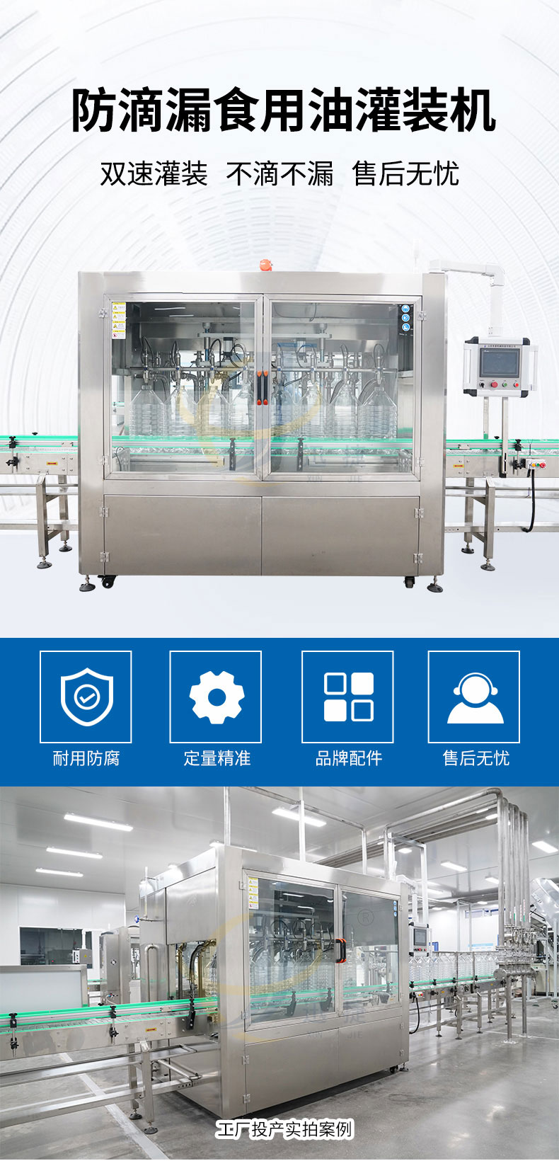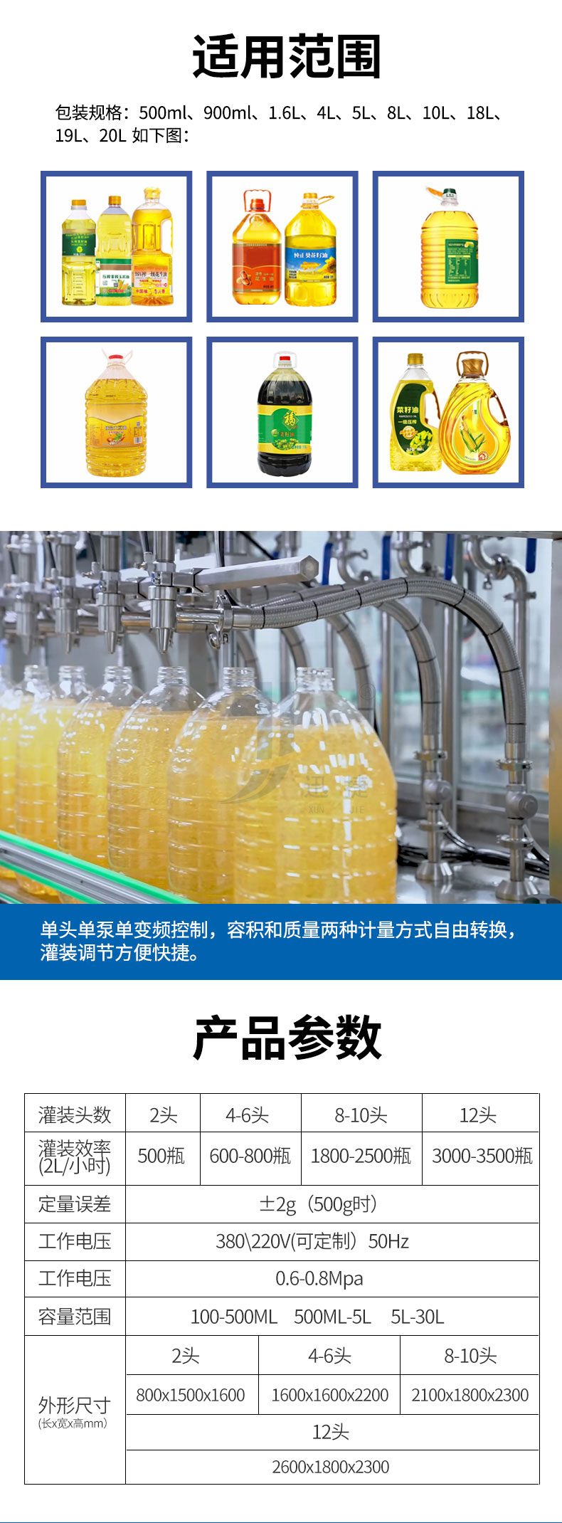 全自動八頭食用油灌裝機單頭單泵單變頻控制,容積和質(zhì)量兩種計量方式自由轉(zhuǎn)換,灌裝調(diào)節(jié)方便快捷。