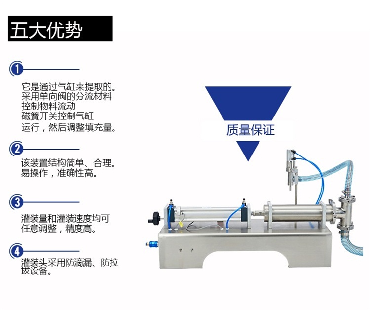 A、該設(shè)備通過氣缸帶動一個活塞來抽取和打出物料,用單向閥控制物料流向,并以磁簧開關(guān)控制氣缸的行程,即可調(diào)節(jié)灌裝量。
